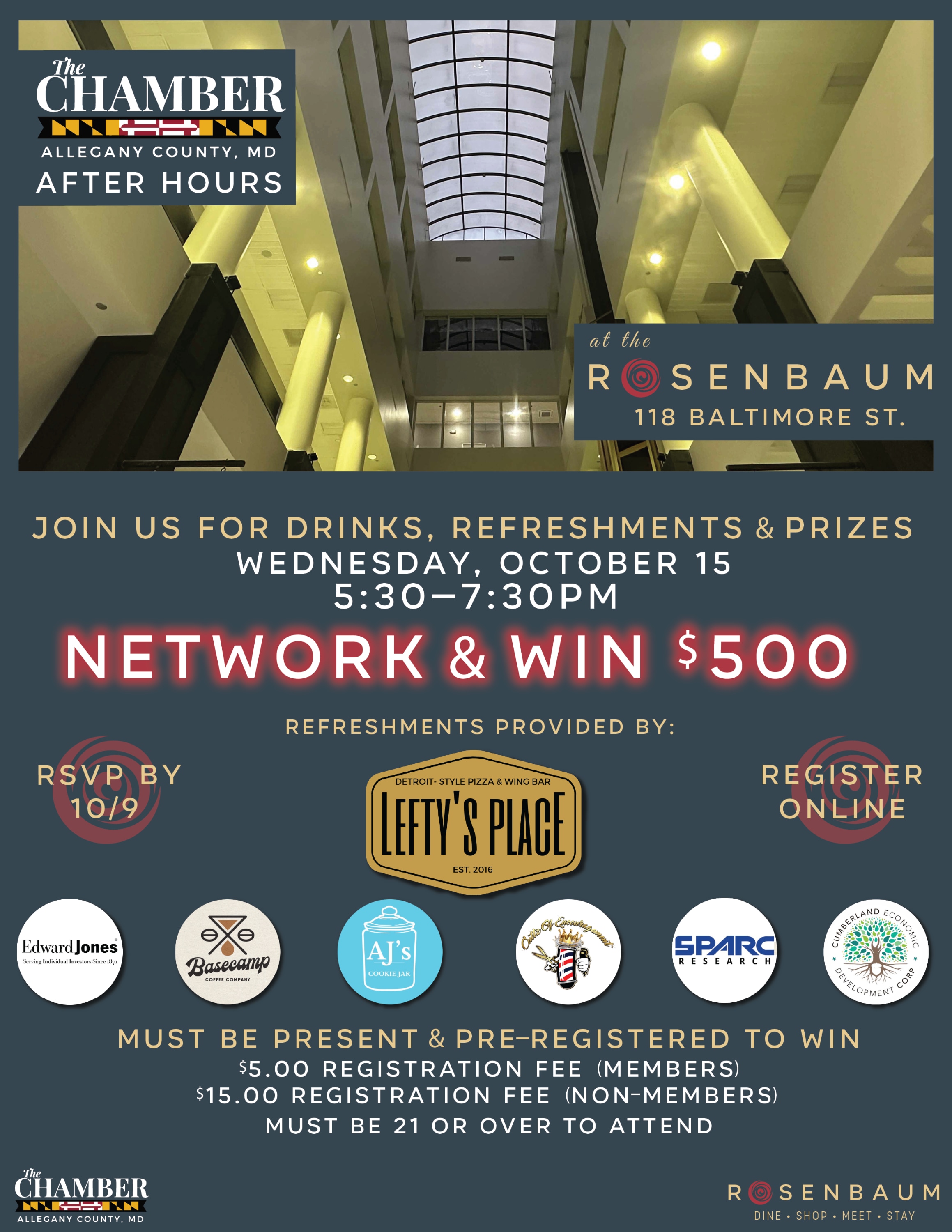 Chamber After Hours Join us every 3rd Wednesday of the month from 5:30–7:30 PM for Chamber After Hours! Each month features a different host and location, giving you the chance to explore unique businesses and venues across the region while making valuable connections. This month’s event is hosted by the Rosenbaum, 118 Baltimore Street, Cumberland, MD 21502 Enjoy an evening of networking in a relaxed atmosphere, meet potential new customers, strengthen existing relationships, and discover what our local business community has to offer. ✨ NETWORK & WIN! The prize amount changes monthly, but remember—you must be present and pre-registered to win. Registration Fees: $5.00 (Members) $15.00 (Non-Members) 🔞 Must be 21 or over to attendImages