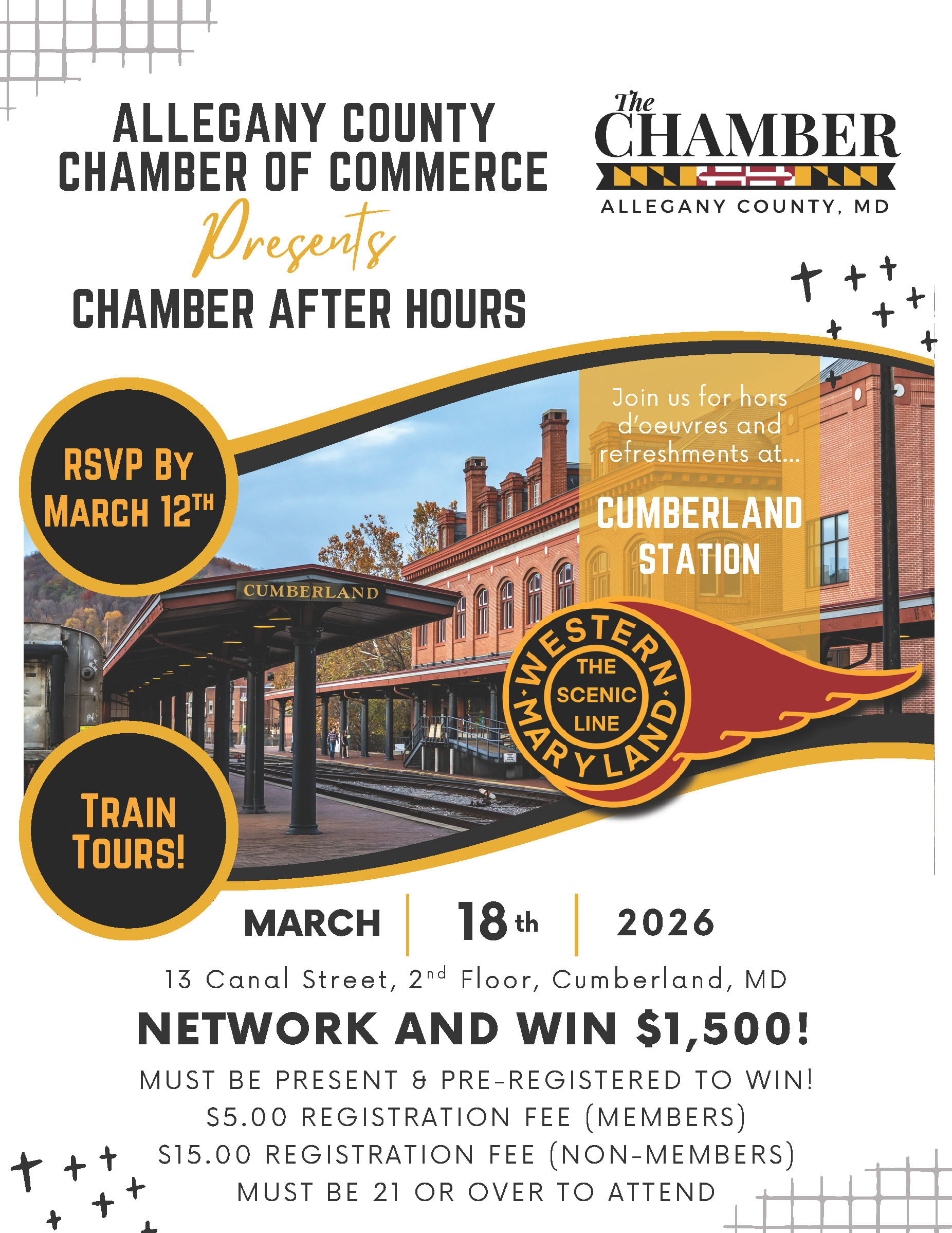 Chamber After Hours Join us every 3rd Wednesday of the month from 5:30–7:30 PM for Chamber After Hours! Each month features a different host and location, giving you the chance to explore unique businesses and venues across the region while making valuable connections. This month’s event is hosted by Western Maryland Scenic Railroad - Canal Street, Cumberland, MD 21502 Enjoy an evening of networking in a relaxed atmosphere, meet potential new customers, strengthen existing relationships, and discover what our local business community has to offer. ✨ NETWORK & WIN! The prize amount changes monthly, but remember—you must be present and pre-registered to win. Registration Fees: $5.00 (Members) $15.00 (Non-Members) 🔞 Must be 21 or over to attend