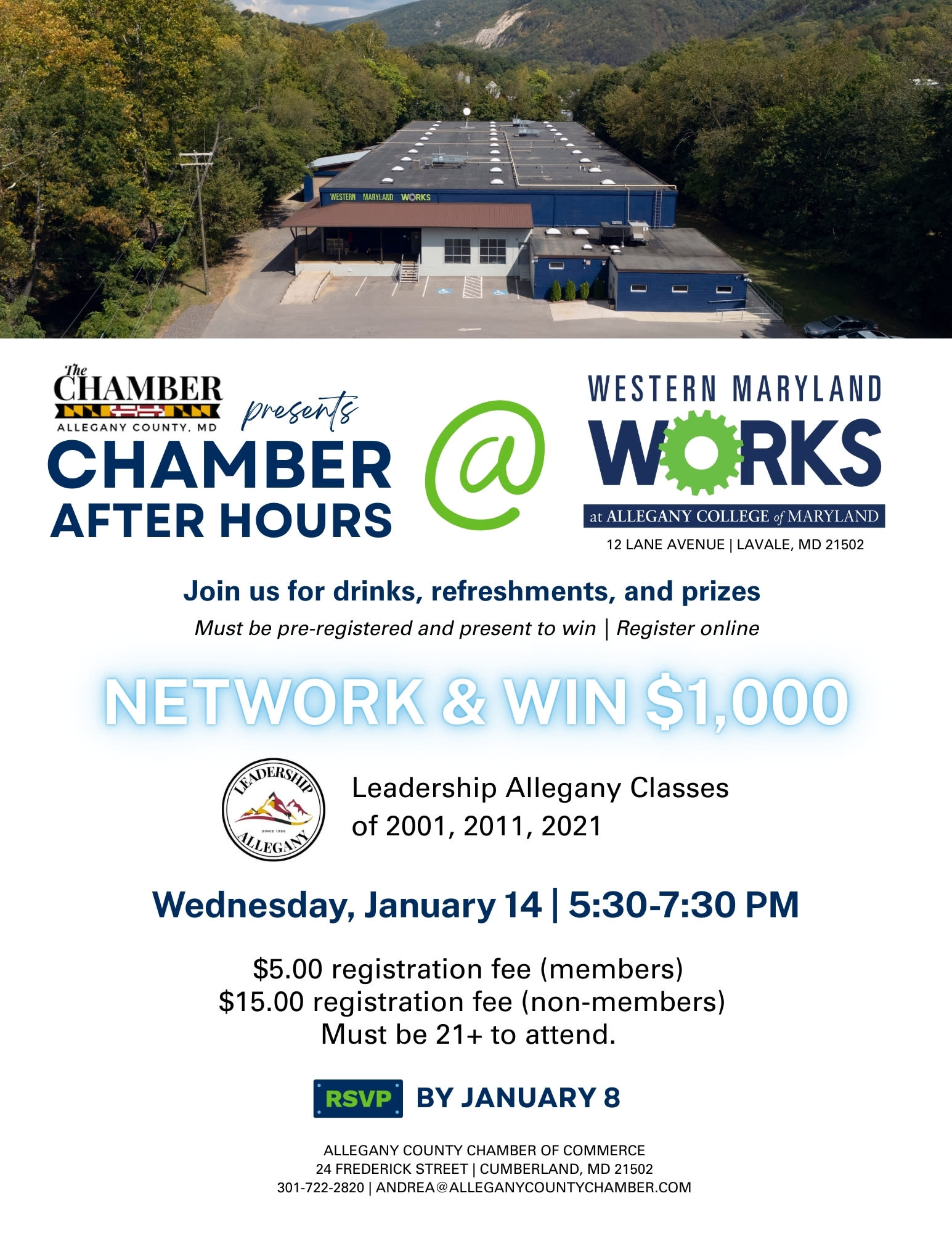 Chamber After Hours Join us every 3rd Wednesday of the month from 5:30–7:30 PM for Chamber After Hours! Each month features a different host and location, giving you the chance to explore unique businesses and venues across the region while making valuable connections. This month’s event is hosted by Western Maryland Works 37 Lane Avenue, Cumberland, MD, 21502 Enjoy an evening of networking in a relaxed atmosphere, meet potential new customers, strengthen existing relationships, and discover what our local business community has to offer. ✨ NETWORK & WIN! The prize amount changes monthly, but remember—you must be present and pre-registered to win. Registration Fees: $5.00 (Members) $15.00 (Non-Members) 🔞 Must be 21 or over to attendImages